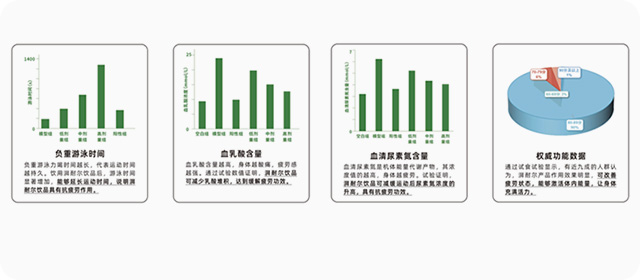 抗疲劳实验:对比空白组与饮用湃耐尔组的负重游泳时间:饮用组延长50% 血乳酸含量: 饮用组降低30%血清尿素氮含量: 饮用组降低25% 结论: 显著提升抗疲劳能力。